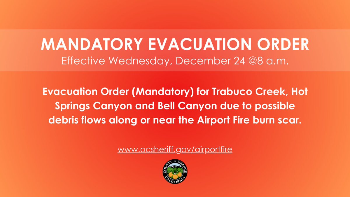 Effective Wednesday, December 24 at 8 am, an Evacuation Order (Mandatory) is issued for Trabuco Creek, Hot Springs Canyon and Bell Canyon due to possible debris flows along or near the Airport Fire burn scar.